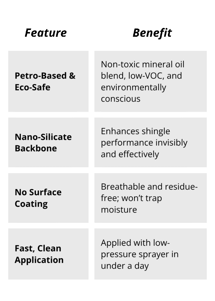 Rejuvenates faded shingles and helps retain granules without adding shine or gloss. The treatment preserves the roof’s original texture and breathability.